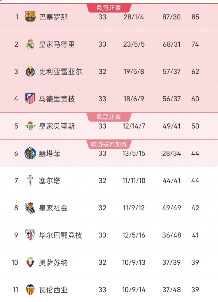 4月26日西甲联赛第32轮比赛皇冠信誉盘,巴萨2-0击败赫塔菲,马德里竞技3-2逆转毕尔巴鄂,瓦伦西亚2-1击败赫罗纳,阿拉维斯2-1皇家马略卡,西甲最新积分出炉,巴萨85分以11分优势遥遥领先,皇马74分次席,黄潜62分第三,马竞60分第四,贝蒂斯50分第五,巴萨有望在下一轮提前夺冠!
