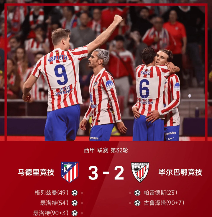 25/26赛季西甲联赛第32轮,马德里竞技迎战毕尔巴鄂竞技。上半场,德-加拉雷塔角球助攻帕雷德斯头球破门。下半场,格列兹曼、瑟洛特5分钟连入2球将比分反超,随后巴里奥斯伤退,补时阶段瑟洛特单刀破门,古鲁泽塔头球建功,最终,马竞3-2毕包结束联赛4连败,33轮过后领先第5名10分,马竞近9场各项赛事仅取得2场胜利,北京时间4月30日3:00,马竞将在主场与阿森纳进行欧冠半决赛首回合的比赛。